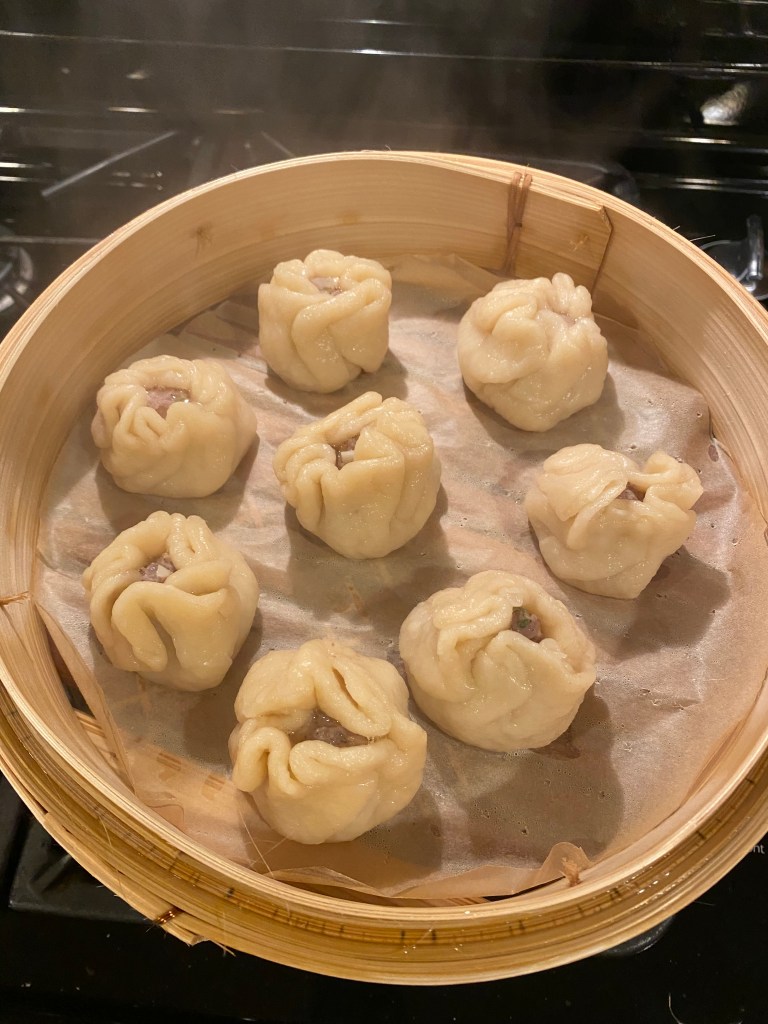 Dip the bottom of each buuz into a bit of oil, or line a steamer rack with lettuce or parchment paper so that buuz does not stick to the rack. Arrange buuz on rack so that they do not touch. We used a bamboo steamer. If you don’t have one, a flat pasta strainer or even a cake rack would work just as well.