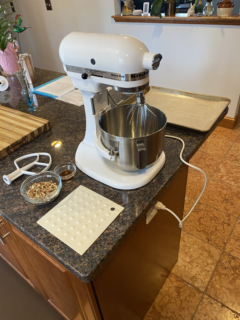The egg whites, at room temperature, are in the mixer bowl, and the silicone pad is to rest the hot pot on, should I need to put it down.